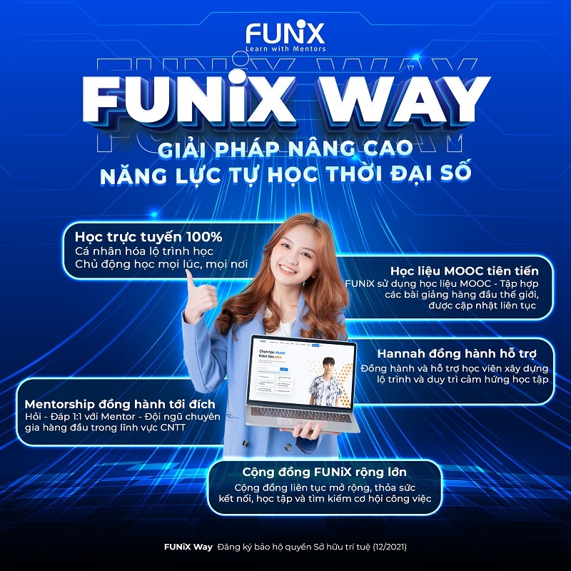Một trong những đặc điểm nổi bật của các khóa học Công nghệ thông tin (CNTT) tại FUNiX chính là mô hình đào tạo FUNiX Way. Đây là một giải pháp học trực tuyến trang bị năng lực tự học cho mỗi cá nhân, khai thác hiệu quả kho tri thức khổng lồ trên Internet và kết nối cộng đồng rộng lớn trong mọi lĩnh vực. Giá trị cốt lõi của FUNiX Way là “học không bằng hỏi, dạy không bằng dỗ”. “Hỏi” là biểu hiện của việc học chủ động. “Dỗ” là cách thức giúp người học rèn thói quen tự học và duy trì động lực.
